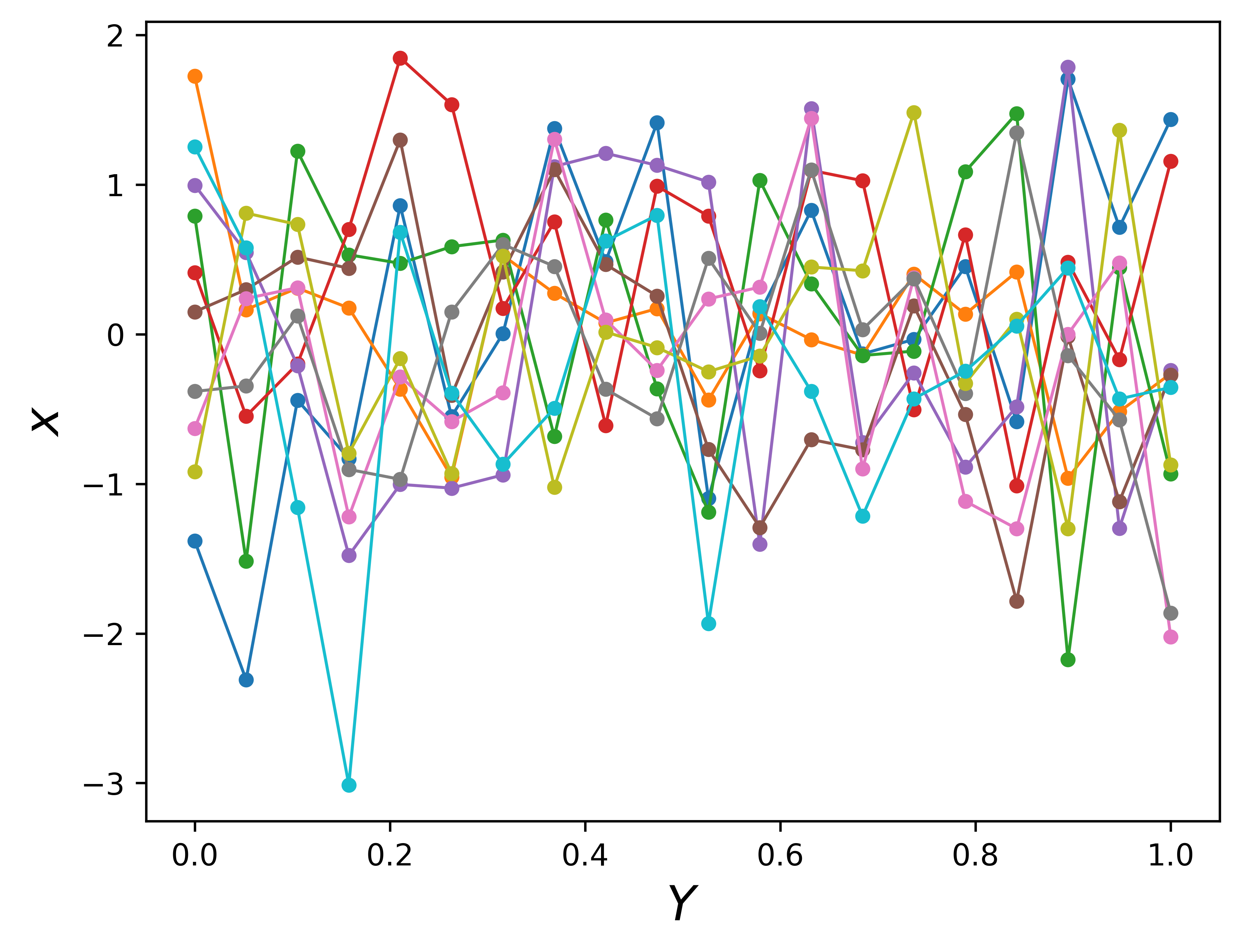 n =20m =10f_random = np.random.normal(size=(n, m))Xshow = np.linspace(0, 1, n).reshape(-1,1) # n number test points in the range of (0, 1)plt.clf()plt.plot(Xshow, f_random, '-o', linewidth=1, markersize=3, markeredgewidth=2)plt.xlabel(r'$Y$', fontsize =16)plt.ylabel(r'$x$', fontsize =16)# plt.show()# plt.savefig('1d_random.png', bbox_inches='tight', dpi=600)plt.savefig('random_x1_x20')