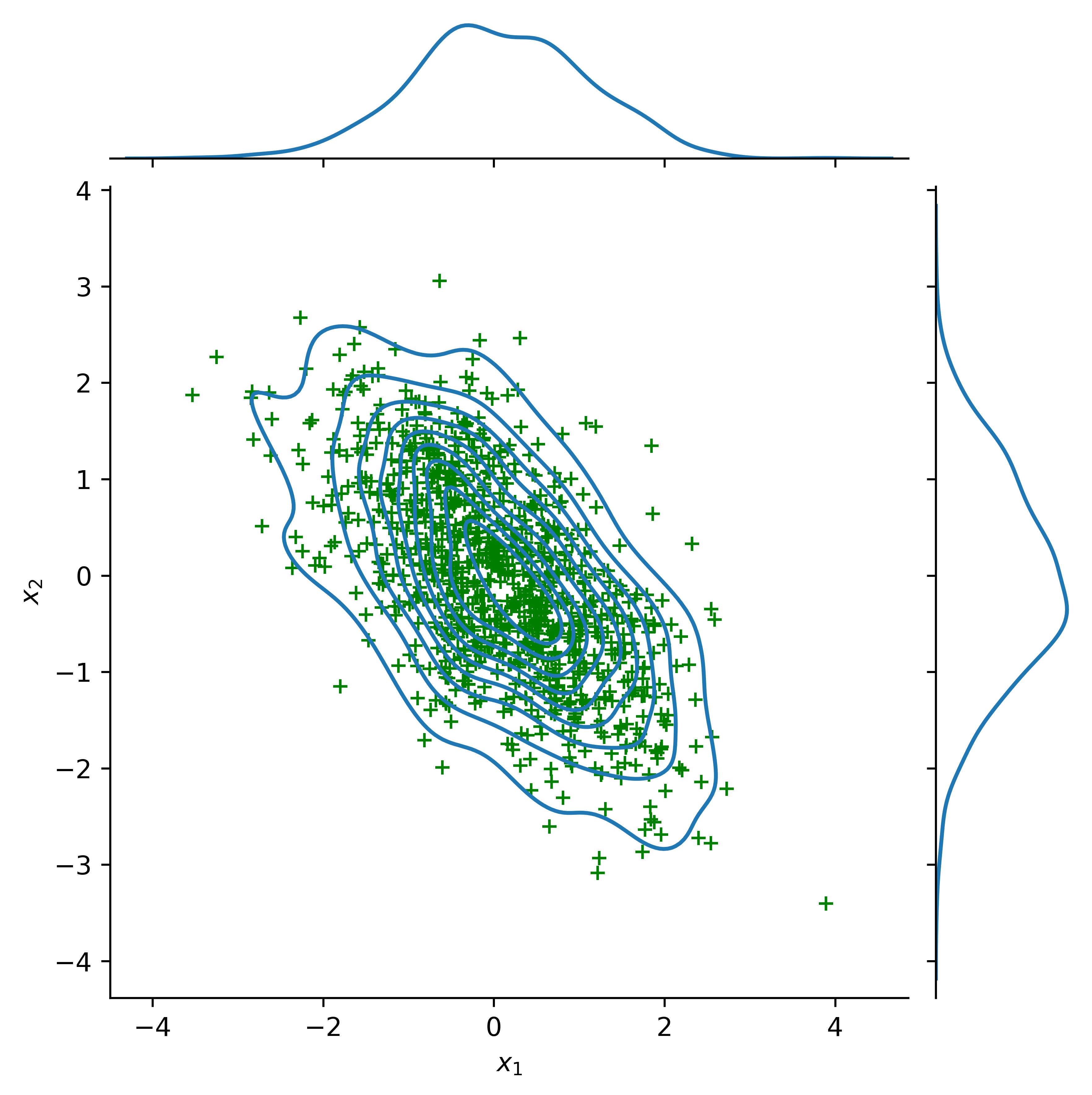 import pandas as pdimport seaborn as snsmean, cov = [0., 0.], [(1., -0.6), (-0.6, 1.)]data = np.random.multivariate_normal(mean, cov, 1000)df = pd.DataFrame(data, columns=["x1", "x2"])# Updated parameter names to current seaborn syntaxg = sns.jointplot(x="x1", y="x2", data=df, kind="kde")g.plot_joint(plt.scatter, c="g", s=30, linewidth=1, marker="+")g.set_axis_labels("$x_1$", "$x_2$") # Changed to subscript notationplt.show()