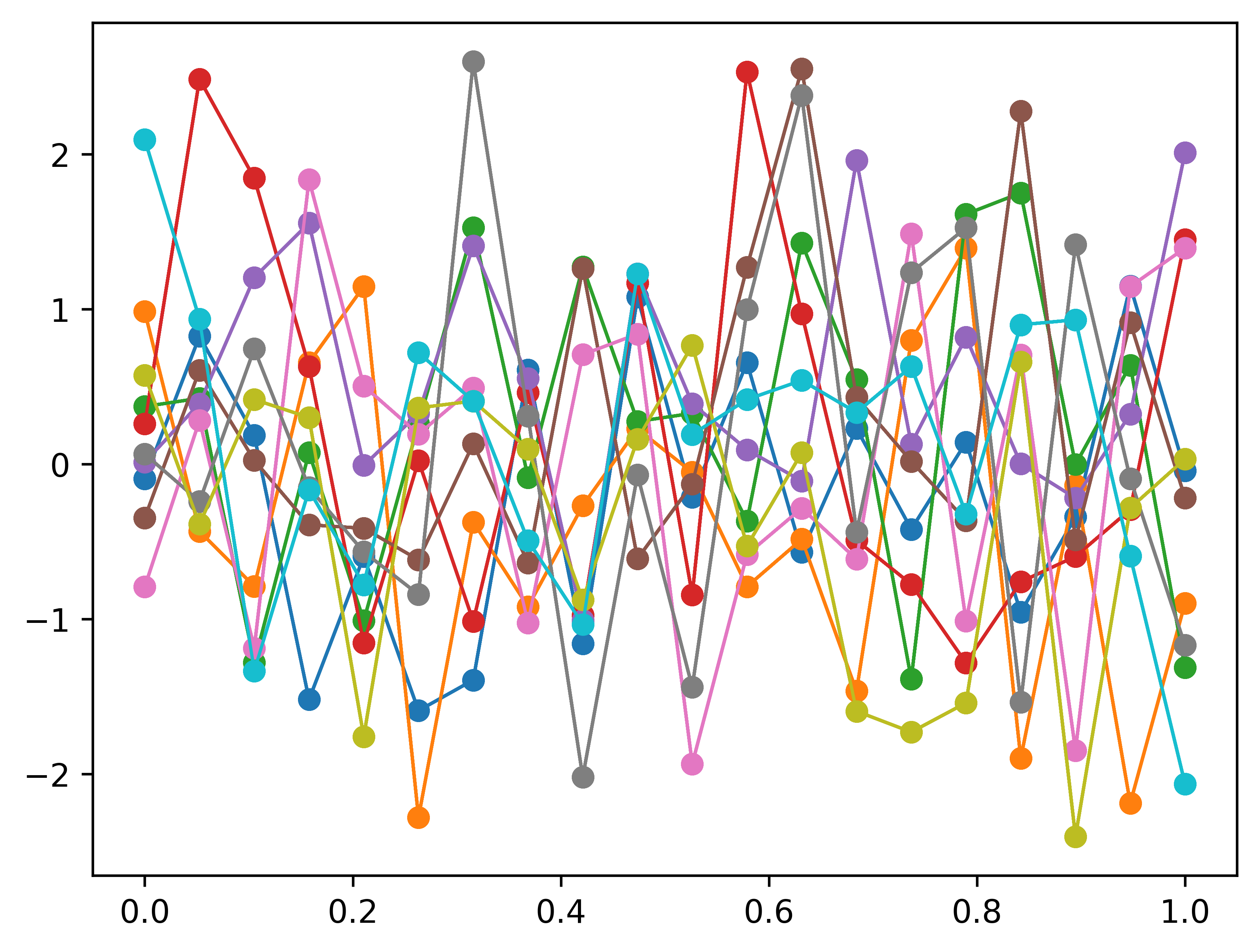 n =20m =10mean = np.zeros(n)cov = np.eye(n)f_prior = np.random.multivariate_normal(mean, cov, m).Tplt.clf()#plt.plot(Xshow, f_prior, '-o')Xshow = np.linspace(0, 1, n).reshape(-1,1) # n number test points in the range of (0, 1)for i inrange(m): plt.plot(Xshow, f_prior, '-o', linewidth=1)# plt.title('10 samples of the 20-D gaussian prior')# plt.show()plt.savefig('20d_gaussian_prior')