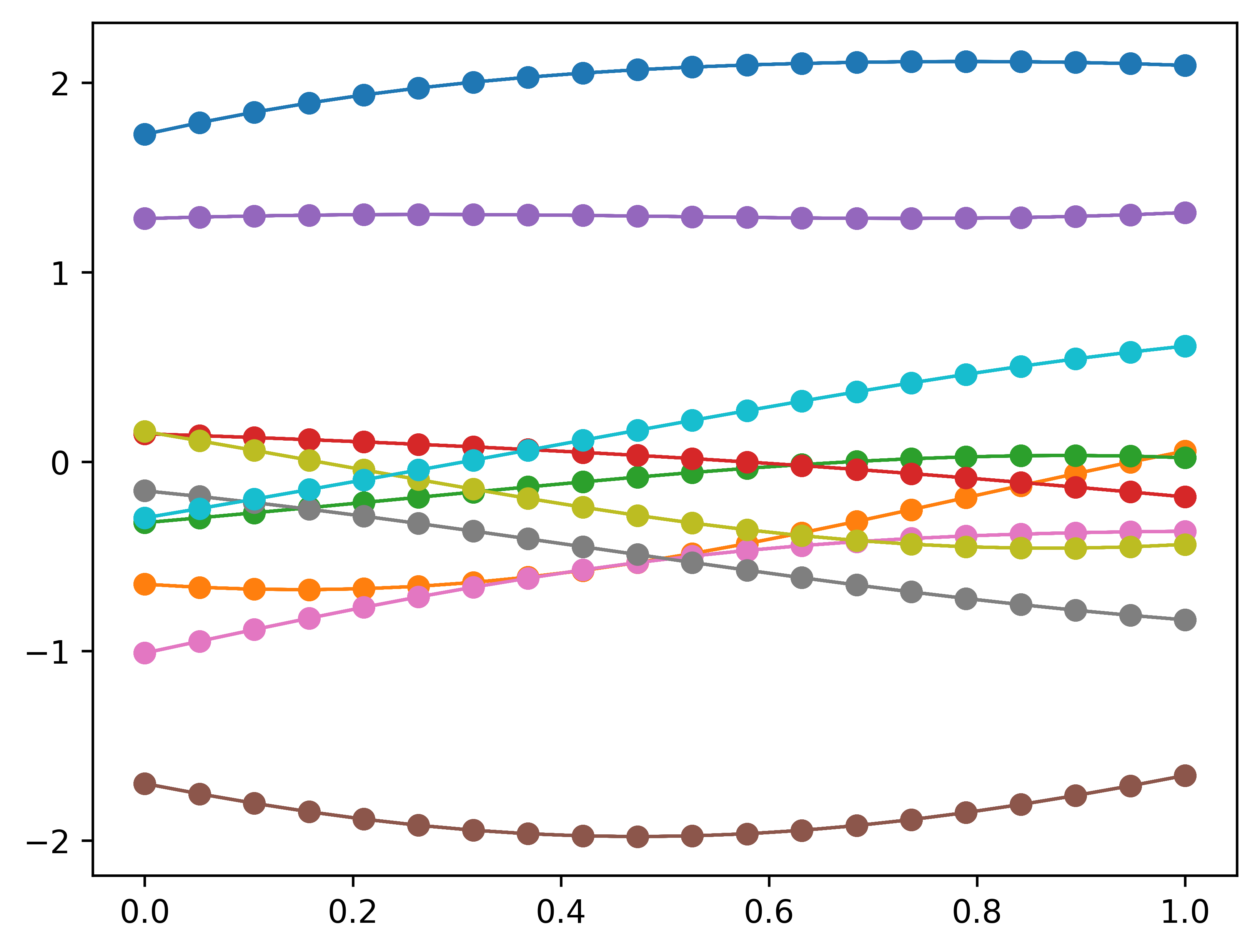 n =20m =10Xshow = np.linspace(0, 1, n).reshape(-1,1) # n number test points in the range of (0, 1)K_ = kernel(Xshow, Xshow) # k(x_star, x_star)mean = np.zeros(n)cov = np.eye(n)f_prior = np.random.multivariate_normal(mean, K_, m).Tplt.clf()Xshow = np.linspace(0, 1, n).reshape(-1,1) # n number test points in the range of (0, 1)for i inrange(m): plt.plot(Xshow, f_prior, '-o', linewidth=1)# plt.title('10 samples of the 20-D gaussian kernelized prior')# plt.show()plt.savefig('20d_gaussian_kernel_prior')