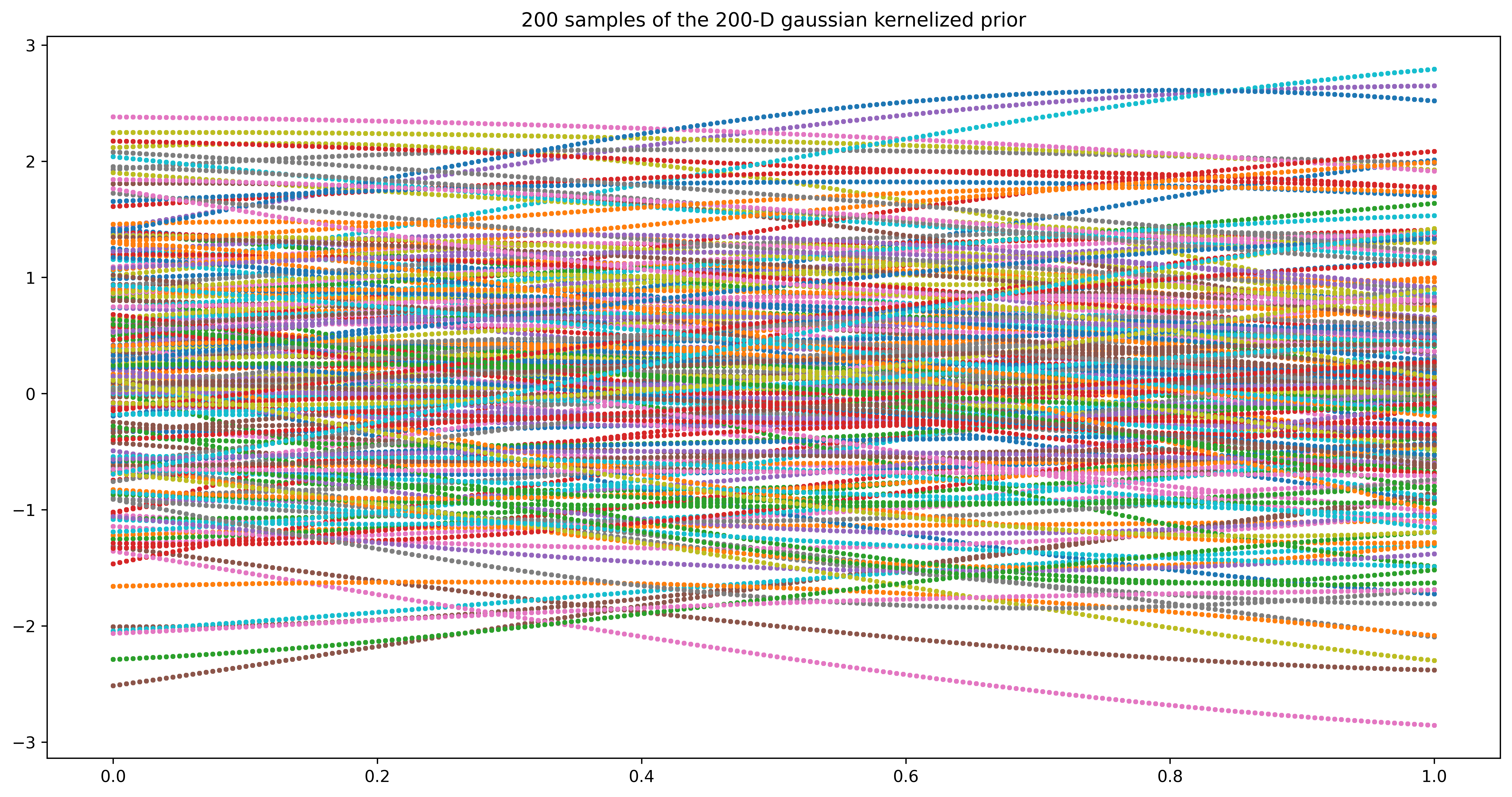 n =200m =200Xshow = np.linspace(0, 1, n).reshape(-1,1)K_ = kernel(Xshow, Xshow) # k(x_star, x_star)mean = np.zeros(n)cov = np.eye(n)f_prior = np.random.multivariate_normal(mean, K_, m).Tplt.clf()#plt.plot(Xshow, f_prior, '-o')Xshow = np.linspace(0, 1, n).reshape(-1,1) # n number test points in the range of (0, 1)plt.figure(figsize=(16,8))for i inrange(m): plt.plot(Xshow, f_prior, 'o', linewidth=1, markersize=2, markeredgewidth=1)plt.title('200 samples of the 200-D gaussian kernelized prior')#plt.axis([0, 1, -3, 3])plt.show()#plt.savefig('priorT.png', bbox_inches='tight', dpi=300)