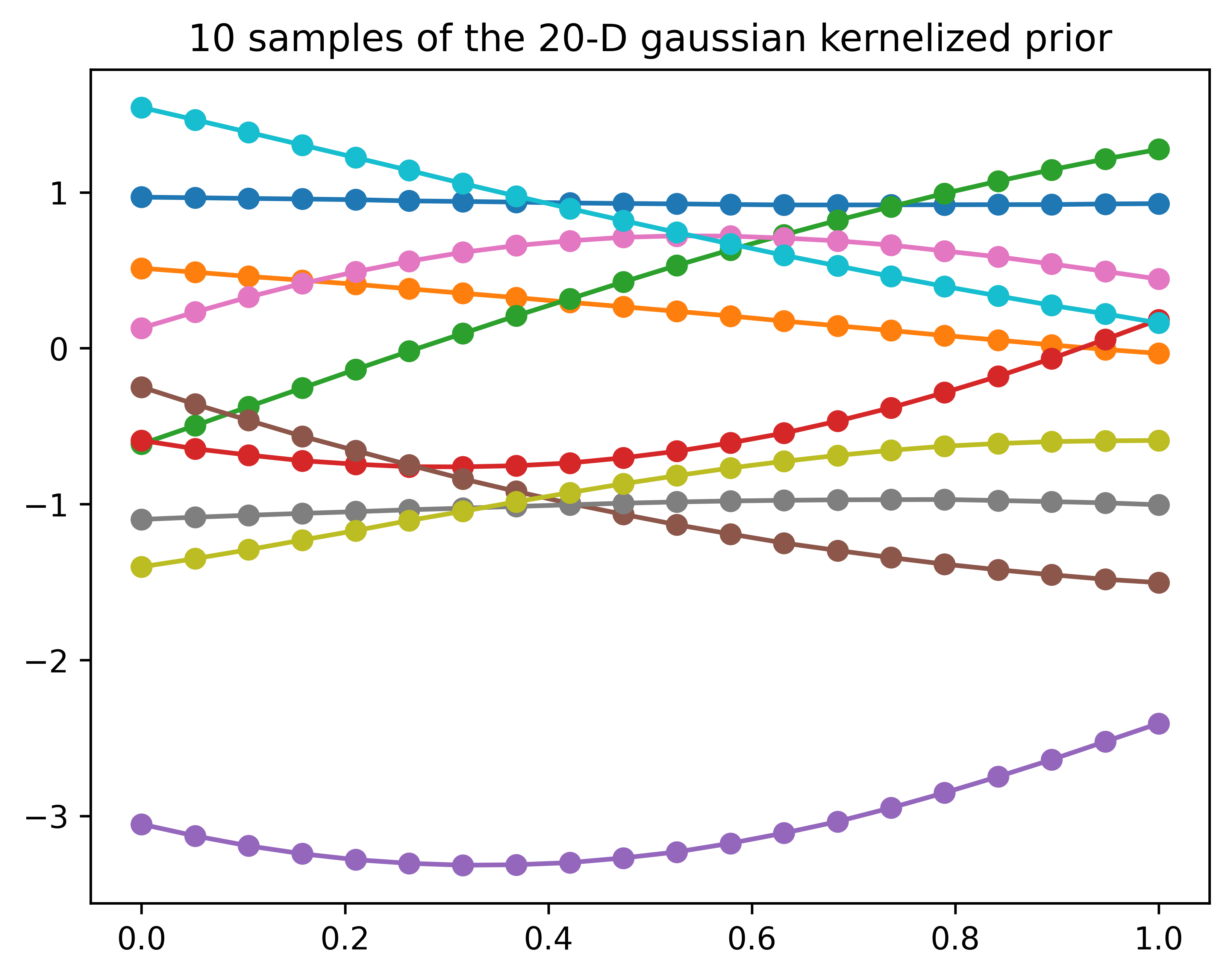 Wait for a second, what we are trying to do by connecting random generated independent Gaussian points? Even these lines look like functions, but they are too noisy. If \(X\) is our input space, these functions are meaningless for the regression task. We can do no prediction by using these functions. The functions should be smoother, meaning input points that are close to each other should have similar values of the function.
