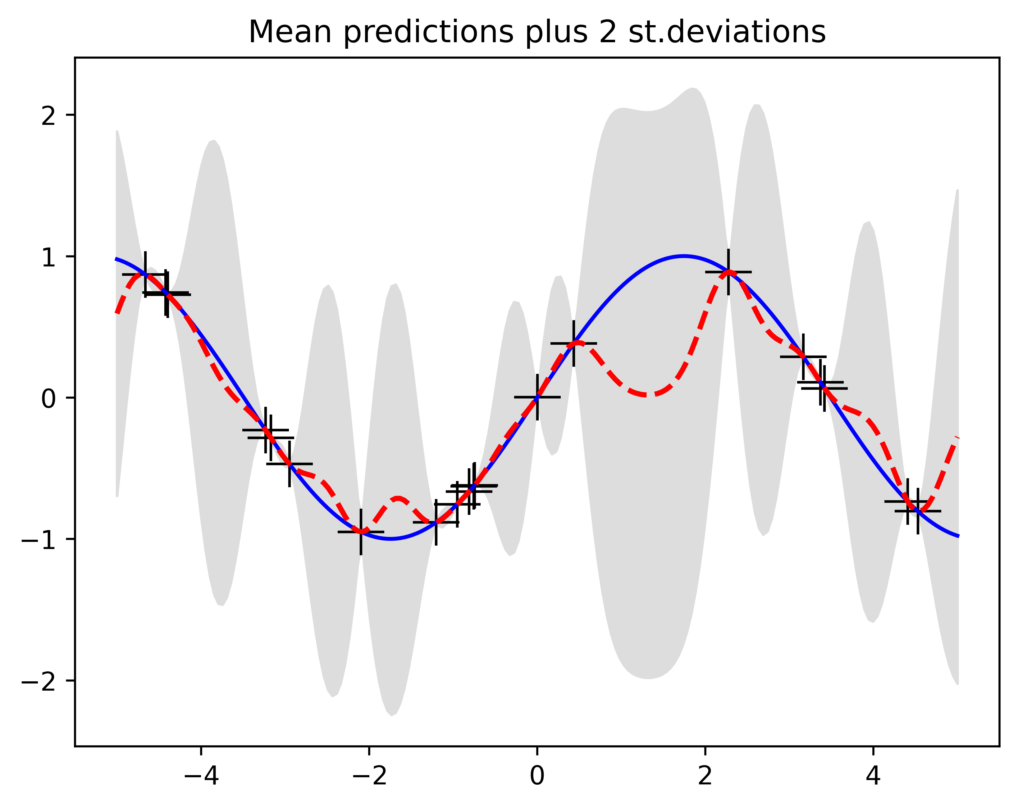 # Sample some input points and noisy versions of the function evaluated at# these points.N =20# number of existing observation points (training points).n =200# number of test points.s =0.00005# noise variance.X = np.random.uniform(-5, 5, size=(N,1)) # N training pointsy = f(X) + s*np.random.randn(N)K = kernel(X, X)L = np.linalg.cholesky(K + s*np.eye(N)) # line 1# points we're going to make predictions at.Xtest = np.linspace(-5, 5, n).reshape(-1,1)# compute the mean at our test points.Lk = np.linalg.solve(L, kernel(X, Xtest)) # k_star = kernel(X, Xtest), calculating v := l\k_starmu = np.dot(Lk.T, np.linalg.solve(L, y)) # \alpha = np.linalg.solve(L, y)# compute the variance at our test points.K_ = kernel(Xtest, Xtest) # k(x_star, x_star)s2 = np.diag(K_) - np.sum(Lk**2, axis=0)s = np.sqrt(s2)# PLOTS:plt.figure(1)plt.clf()plt.plot(X, y, 'k+', ms=18)plt.plot(Xtest, f(Xtest), 'b-')plt.gca().fill_between(Xtest.flat, mu-2*s, mu+2*s, color="#dddddd")plt.plot(Xtest, mu, 'r--', lw=2)#plt.savefig('predictive.png', bbox_inches='tight', dpi=300)plt.title('Mean predictions plus 2 st.deviations')plt.show()#plt.axis([-5, 5, -3, 3])