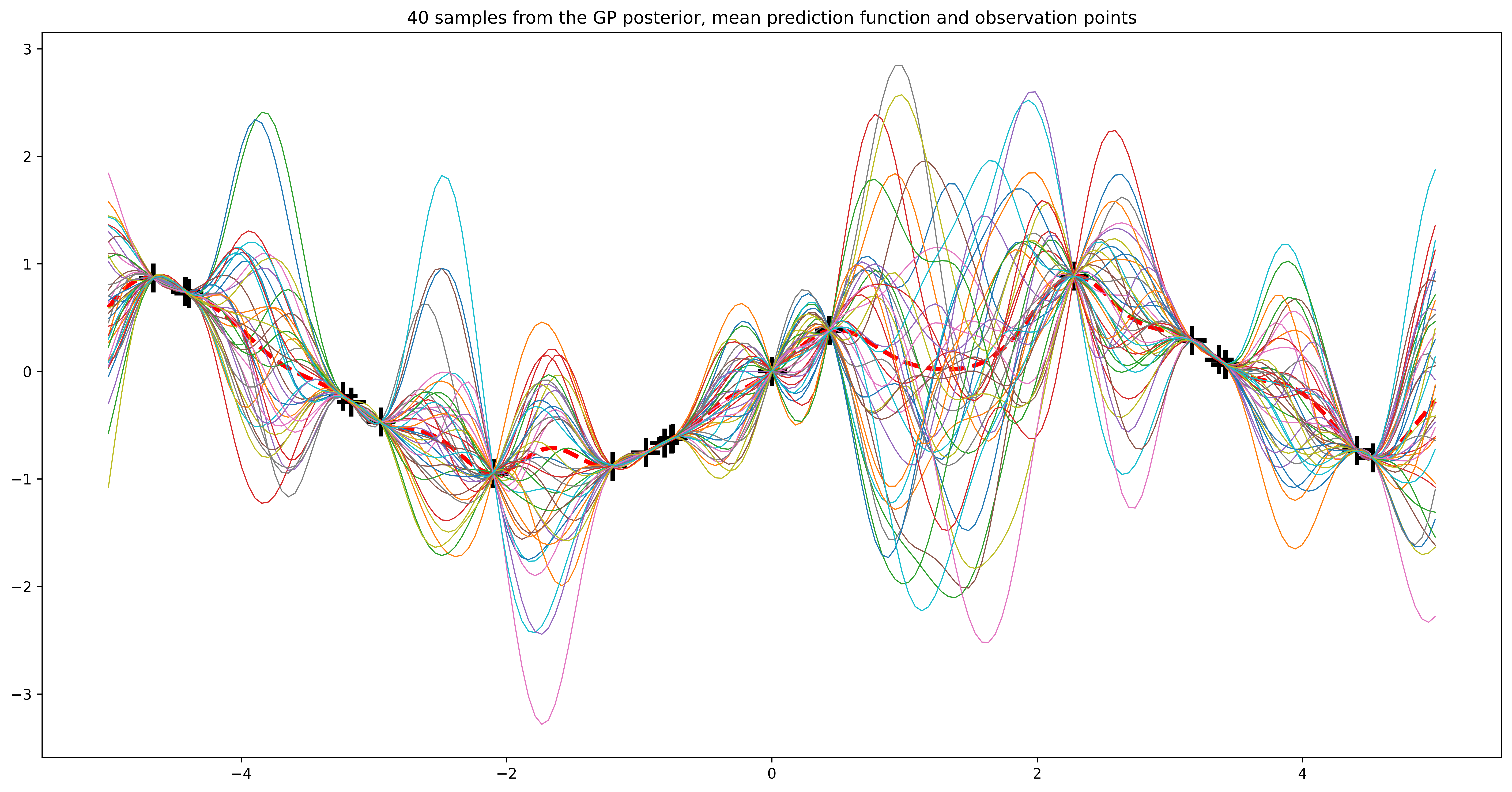 We plotted m=40 samples from the Gaussian Process posterior together with the mean function for prediction and the observation data points (training dataset). It’s clear all posterior functions collapse at all observation points.