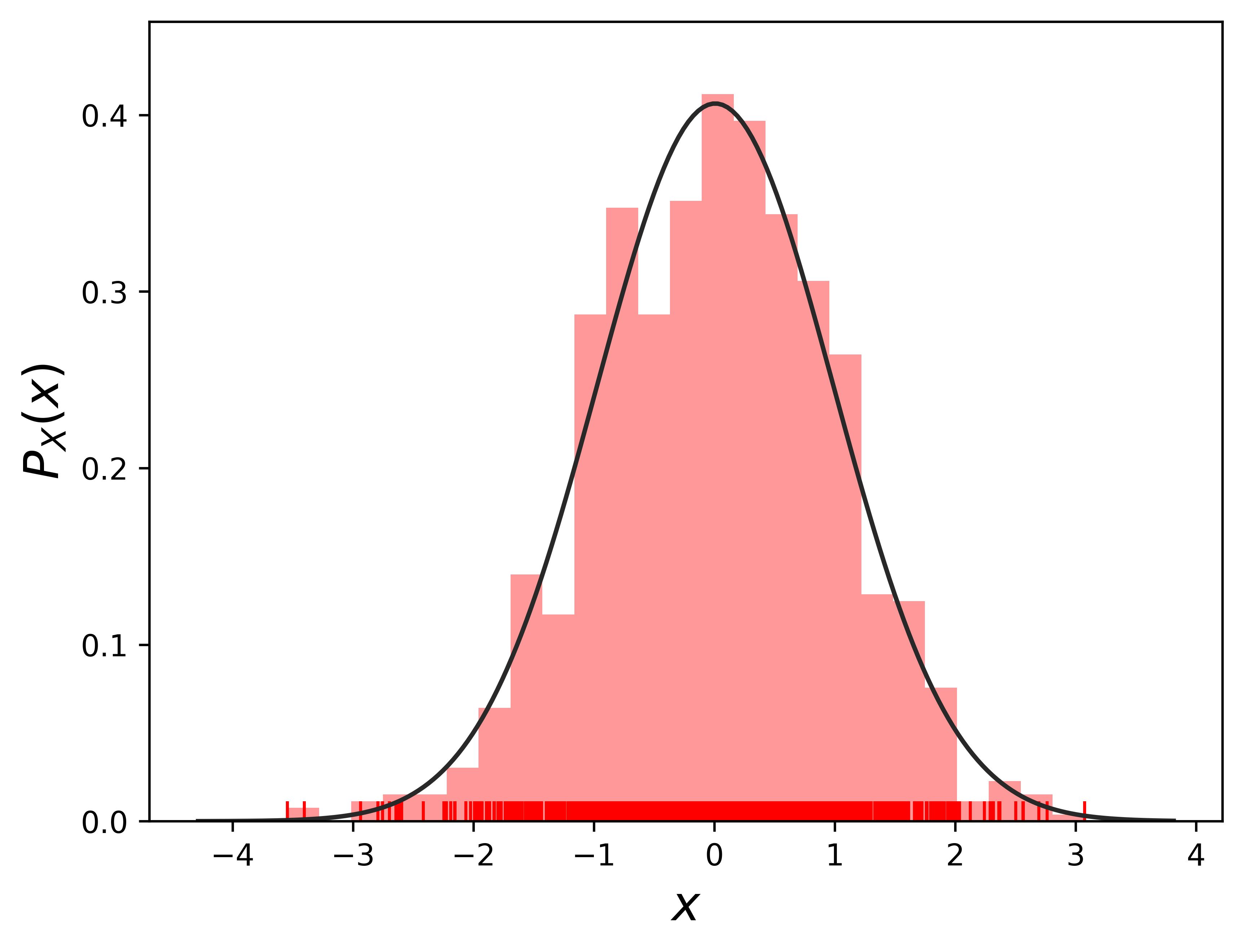from scipy.stats import norm# Plot 1-D gaussiann =1# n number of independent 1-D gaussianm=1000# m points in 1-D gaussianf_random = np.random.normal(size=(n, m))# more information about 'size': https://www.sharpsightlabs.com/blog/numpy-random-normal/#print(f_random.shape)for i inrange(n):#sns.distplot(f_random[i], hist=True, rug=True, vertical=True, color="orange") sns.distplot(f_random[i], hist=True, rug=True, fit=norm, kde=False, color="r", vertical=False)#plt.title('1000 random samples by a 1-D Gaussian')plt.xlabel(r'$x$', fontsize =16)plt.ylabel(r'$P_X(x)$', fontsize =16)# plt.show()# plt.savefig('1d_random.png', bbox_inches='tight', dpi=600)plt.savefig('1d_random')