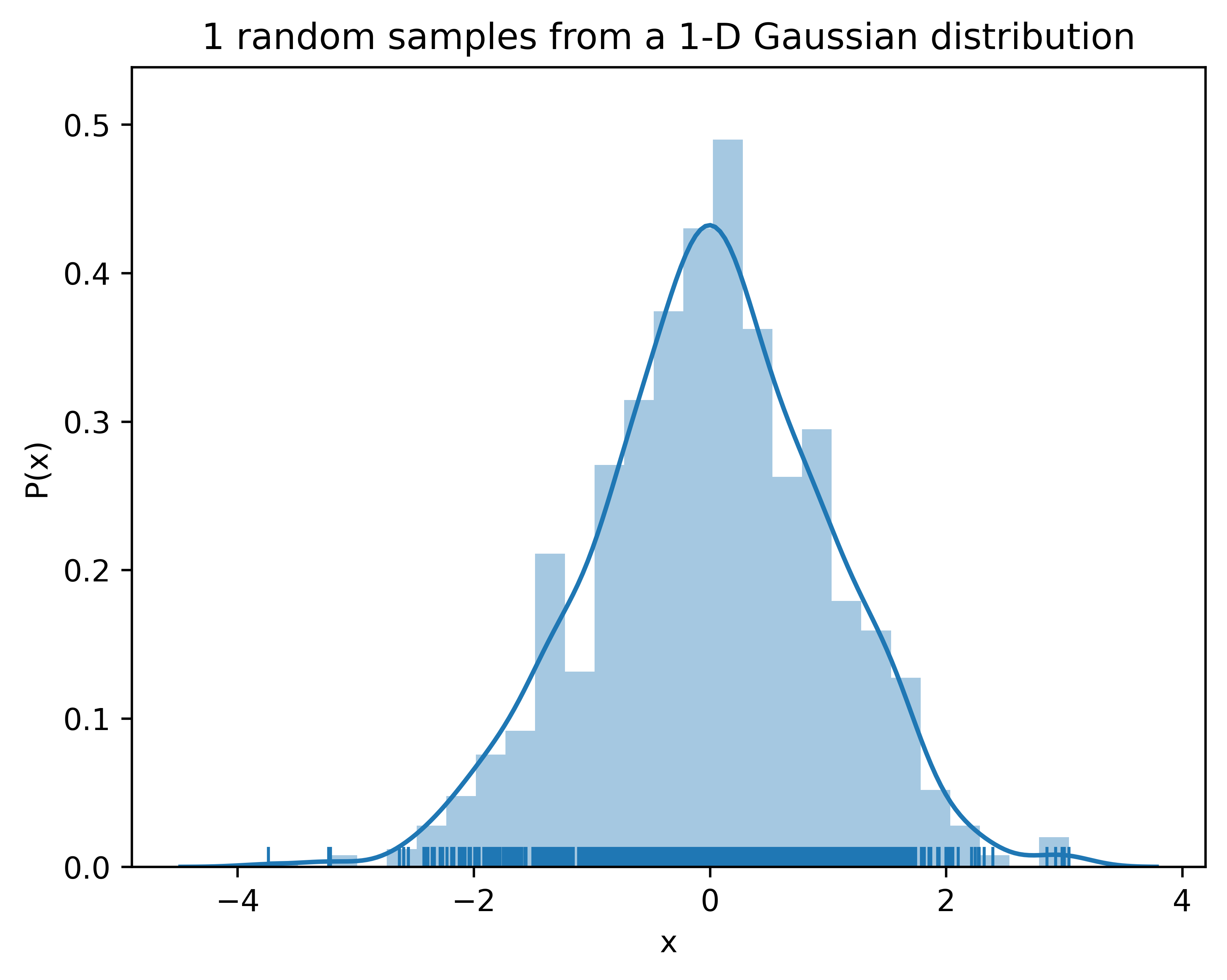 # Plot 1-D gaussiann =1# n number of independent 1-D gaussianm=1000# m points in 1-D gaussianf_random = np.random.normal(size=(n, m))# more information about 'size': https://www.sharpsightlabs.com/blog/numpy-random-normal/#print(f_random.shape)for i inrange(n):#sns.distplot(f_random[i], hist=True, rug=True, vertical=True, color="orange") sns.distplot(f_random[i], hist=True, rug=True)plt.title('1 random samples from a 1-D Gaussian distribution')plt.xlabel('x')plt.ylabel('P(x)')plt.show()