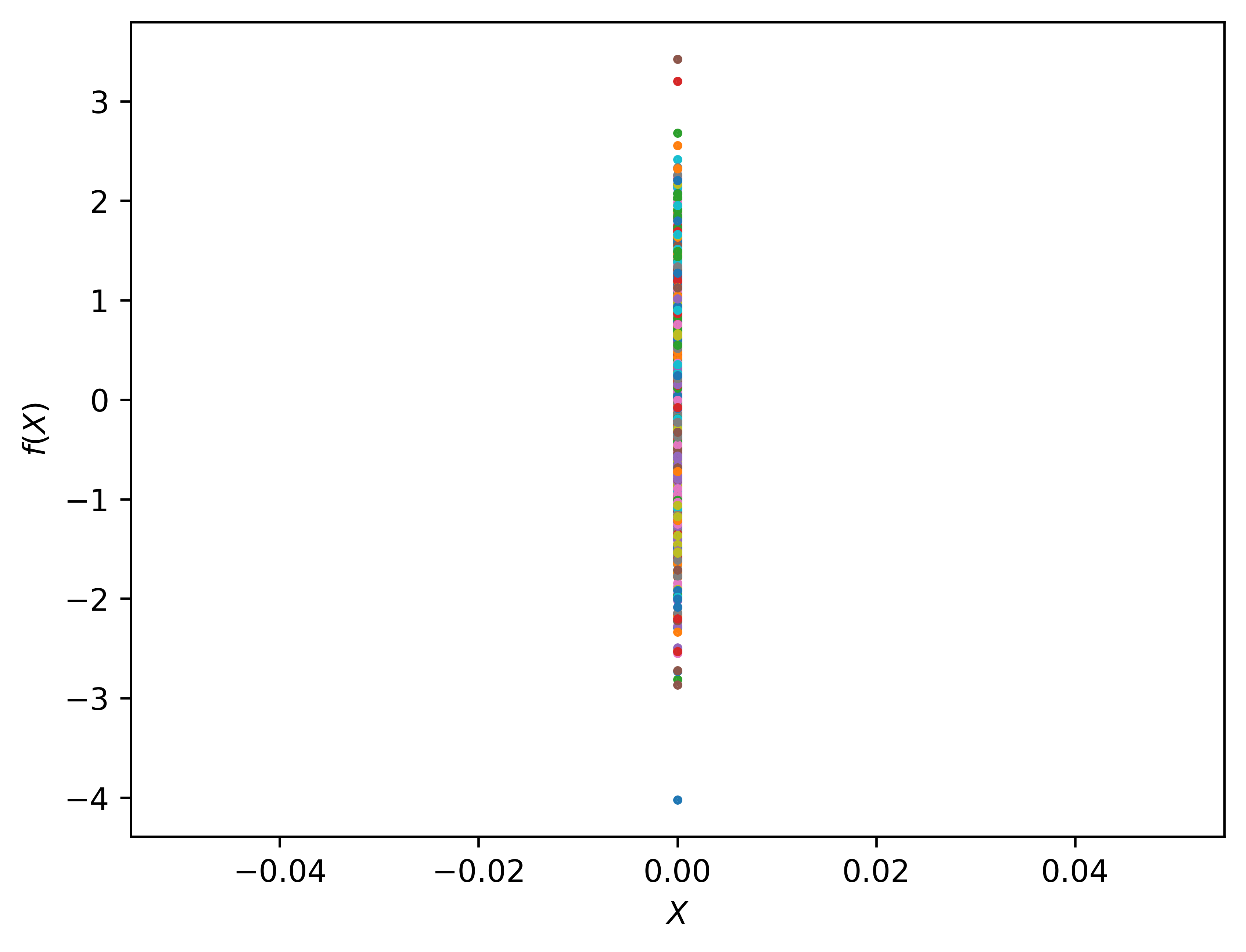 n =1# n number of independent 1-D gaussianm=1000# m points in 1-D gaussianf_random = np.random.normal(size=(n, m))Xshow = np.linspace(0, 1, n).reshape(-1,1) # n number test points in the range of (0, 1)plt.clf()plt.plot(Xshow, f_random, 'o', linewidth=1, markersize=1, markeredgewidth=2)plt.xlabel('$X$')plt.ylabel('$f(X)$')plt.show()