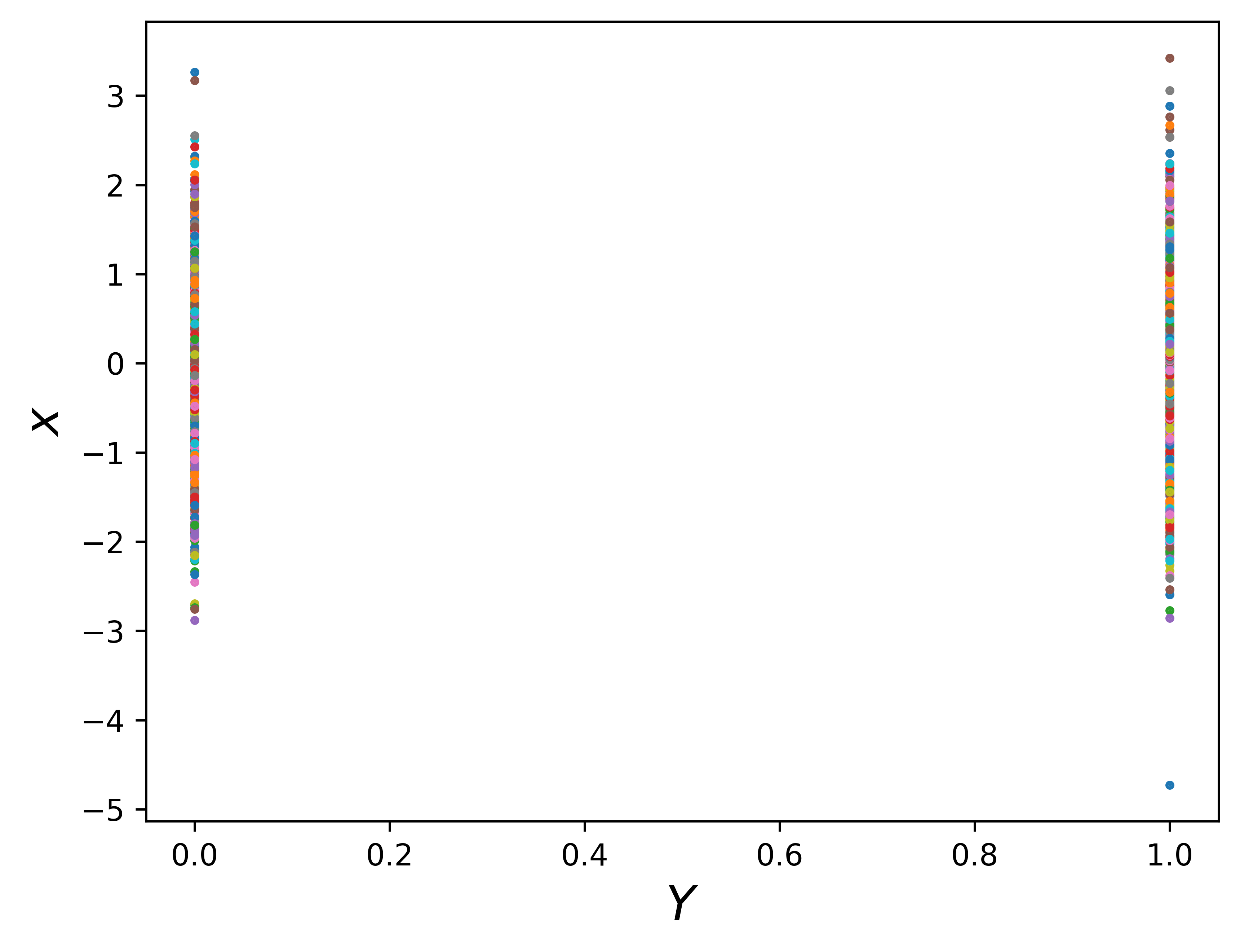 It’s clear that the vector \(X_1\) is Gaussian. It looks like we did nothing but vertically plot the vector points \(X_1\). Next, we can plot multiple independent Gaussian in the \(X-Y\) coordinates. For example, put vector \(X_1\) at at \(X = 0\) and another vector \(X_2\) at at \(X = 1\).