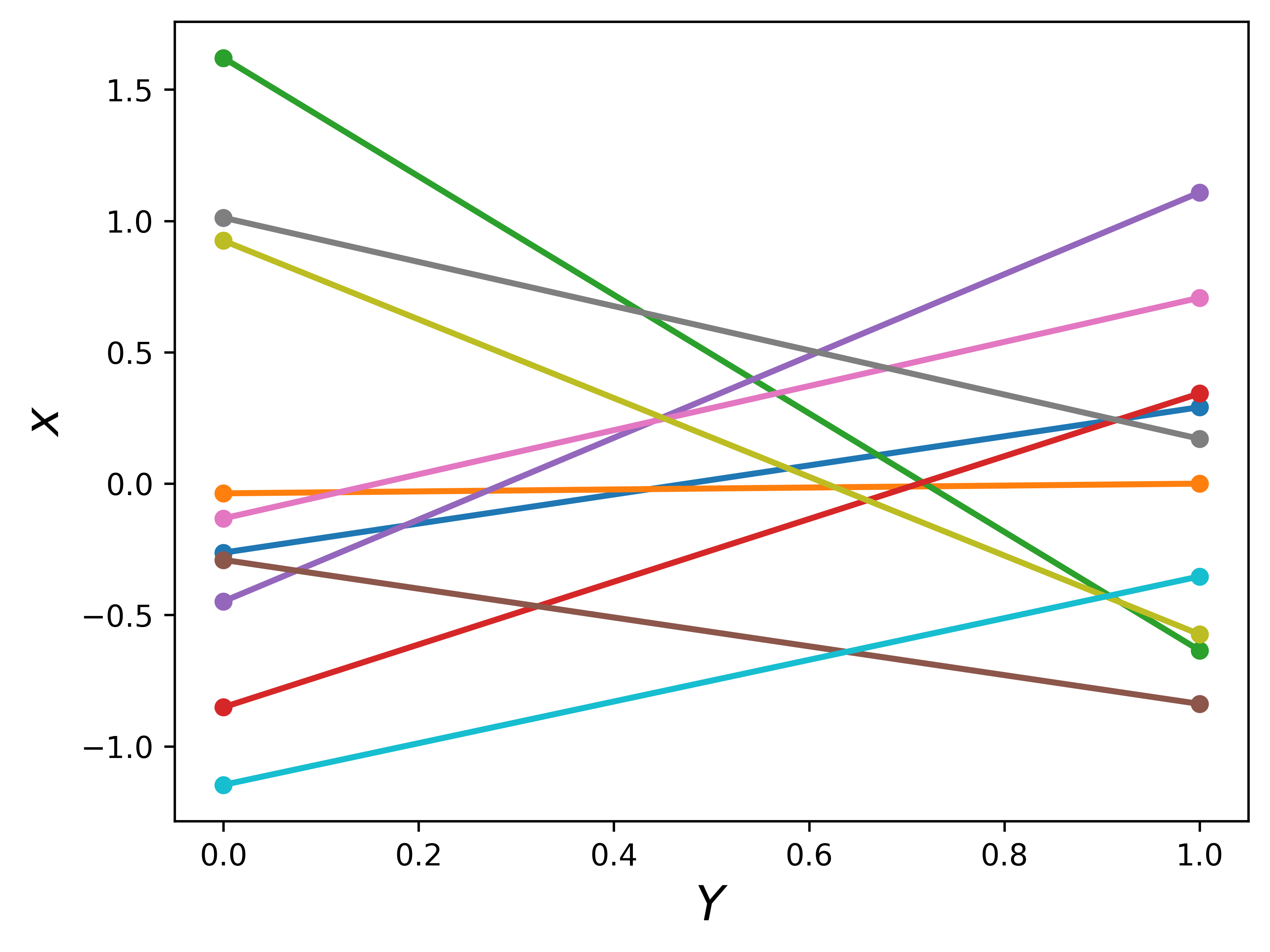 Let’s do something interesting. Let’s connect points of \(X_1\) and \(X_2\) by lines. For now, we only generate 10 random points for \(X_1\) and \(X_2\), and then join them up as 10 lines. Keep in mind, these random generated 10 points are Gaussian.