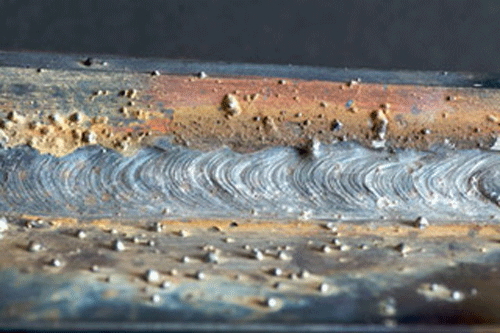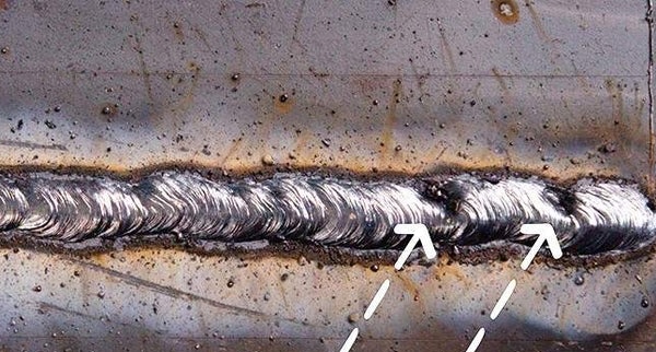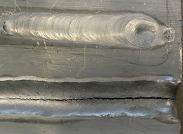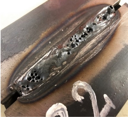 1. **Visual Characteristics**: The weld in the fourth image appears to have a series of small, irregular holes or cavities along the length of the weld bead. These cavities are distributed unevenly and seem to be embedded within the weld metal.