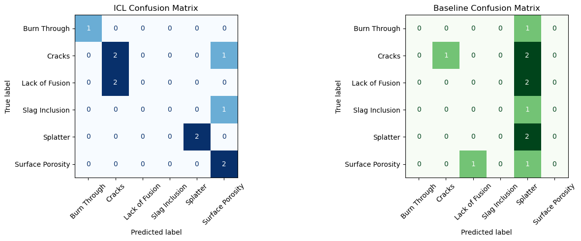 To contextualize performance, the ICL approach is compared against a traditional machine-learning baseline that must learn directly from pixel-level information. While the baseline relies on supervised training and engineered features, the LLM derives its classification behavior purely from pattern recognition using images and the prompt. When evaluated on unseen weld defect images, ICL consistently performs better than the baseline—demonstrating stronger generalization from just a few examples and outperforming the benchmark in overall accuracy. These results highlight the efficiency and adaptability of ICL for inspection-style tasks, especially when training data is scarce or rapid deployment is required.